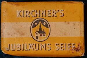 Seife zum 100-Jährigen Bestehen der Seifenfabrik Kirchner in Saarbrücken im Jahr 1949. Beschriftung auf der Frontseite: KIRCHNER'S JUBILÄUMS SEIFE Beschriftung auf der Rückseite: 100 JAHRE KIRCHNER'S SEIFEN