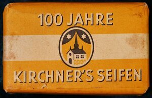 Seife zum 100-Jährigen Bestehen der Seifenfabrik Kirchner in Saarbrücken im Jahr 1949. Beschriftung auf der Frontseite: KIRCHNER'S JUBILÄUMS SEIFE Beschriftung auf der Rückseite: 100 JAHRE KIRCHNER'S SEIFEN