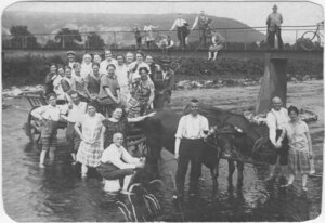 Schwarzweißfotografie als Ansichtskartendruck mit weißem Rand. Auf dem Foto ist die Servicemannschaft des alten Kurhotel in Bad Bodendorf abgebildete. In der vorderen Reihe sitzen v. r. Franz Hardt (*03.10.1922 + 25.05.2005), Joseph Hardt jr. (*15.02.1879 + 17.09.1950), Matthias Hardt (*31.01.1927 +27.02.1985) und Johann Welsch. In der Mitte der zweiten Reihe Josef Hardt, der älteste Sohn des Josef Hardt (*19.11.1848 +18.11.1931), der die Quellen 1901 und 1914 bohrte. In der letzten Reihe links mit weißer Haube Agathe Hardt und 3. v. rechts mit Zöpfen Elisabeth Hardt (*17.05.1920 + 18.10.2009). Rückseitig sind die vor genannten Namen mit Bleistift eingetragen.
