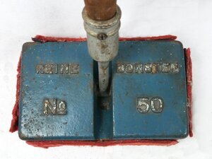 Relativ kleiner blau lackierter Bohner ( Bohnerbesen, Blocker, etc) mit einem langen in eine Eisentülle eingelassen Stiel.. Der Bohner besteht aus einem gusseisernen Block mit einem Bürstenbelag an der Unterseite, der über ein Kugelgelenk an der Oberseite mit dem Arbeitsstiel, z. B. Besenstiel, gelenkig verbunden ist. Die Seiten des Gussblocks sind zur Schonung der Möbel mit rotem Filz beklebt. Auf dem Gusseisen des Bohners befindet sich die Aufschrift "REINE BORSTEN No 50". Der mit dem Kugelgelenk am Blocker befestigte Stiel kann trotz des Kugelgelenks nur in zwei Richtungen bewegt werden. Die Unterseite der Bohnerplatte ist mit Borstenreihen besetzt, Mit dem Blocker wird gebohnert, wozu Bohnerwachs verwendet wird. Das heißt, mittels Hin- und Herbewegen des schweren Arbeitsgeräts werden Holz- und Linoleumböden, gegebenenfalls auch Stragula-Böden, auf Hochglanz poliert. Das erhebliche Gewicht der Bohnerplatte sorgt dabei für ein entsprechendes Andruckgewicht. Dem blau lackierten Bohner ist sein langes Arbeitsleben anzusehen. Die Oberfläche ist ziemlich zerkratzt, der Lack auf der Aufschrift ist teilweise abgängig, die Borsten sind niedergedrückt und der Filz am Rand steht teilweise ab und wirkt beschädigt.