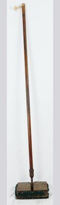Braungrauer oberflächlich angerosteter Bohner ( Bohnerbesen, Blocker, etc.) mit einem langen in eine Eisentülle eingelassen Stiel. Der Bohner besteht aus einem gusseisernen Block mit einem Bürstenbelag an der Unterseite, der über ein Kugelgelenk an der Oberseite mit dem Arbeitsstiel, z. B. Besenstiel, gelenkig verbunden ist. Die Seiten des Gussblocks sind zur Schonung der Möbel mit dunkelgrünen Filz beklebt. Auf dem Gusseisen des Bohners befindet sich die Aufschrift "KLÜZIT GES. GESCH.". Der mit dem Kugelgelenk am Blocker befestigte Stiel kann trotz des Kugelgelenks nur in zwei Richtungen bewegt werden. Die Unterseite der Bohnerplatte ist mit Borstenreihen besetzt, Mit dem Blocker wird gebohnert, wozu Bohnerwachs verwendet wird. Das heißt, mittels Hin- und Herbewegen des schweren Arbeitsgeräts werden Holz- und Linoleumböden, gegebenenfalls auch Stragula-Böden, auf Hochglanz poliert. Das erhebliche Gewicht der Bohnerplatte sorgt dabei für ein entsprechendes Andruckgewicht. Dem braungrau lackierten Bohner ist sein langes Arbeitsleben anzusehen. Die Oberfläche ist fleckig und angerostet, die Borsten sind niedergedrückt und der Filz am Rand steht teilweise ab und wirkt stark beschädigt.