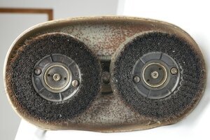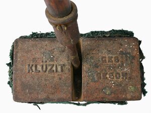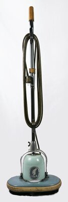 Hellgrün/hellblauer Eletkrobohner ( Elektroblocker etc.) mit einem langen in eine Eisentülle eingelassen Metallstiel. Der Bohner (oder Blocker) besteht aus einem Stiel mit Griff, einer Kuppel mit Plakette für das Firmenlogo (vorne) und einem Typenschild (hinten) in der der Motor untergebracht ist sowie einer Metallplatte unter der zwei kreisförmige mit Borsten besetzte Rotoren angebracht sind. Mit deren Hilfe wird das Bohnerwachs auf dem Boden verteilt und in die Poren des Bodenbelags eingebracht. Der Elektrobohner ist Type 2, Seriennummer 18, ist für einen Anschluss mit 220 Volt und 60 Herz zugelassen und zieht 300 Watt. Er ist VDE zugelassen und hat die Produktionsnummer 860858. Im Vergleich zur Benutzung eines Handbohners muß das deutlich leichtere Grät nur noch an die ensprechenden Stellen geschoben werden. Das mühsame Hin- und Herschieben zur Verteilung des Bohnerwachses mittels Andruck des schweren Geräts entfällt, was die Arbeit deutlich erleichtert. Der Blocker ist ein Produkt aus einer Serien von (mindestens) 5 Blockern für verschiedene Anwendungszwecke. Erfreulicherweise konnten wir einen Werbeprospekt für diese Blocker-Familie erwerben (Siehe Abbildungen 7 bis 10) . Unser Blocker ist das Modell 2 - für den "normalen" Haushalt - der auf dem Prospekt vorgestellten Modelle,