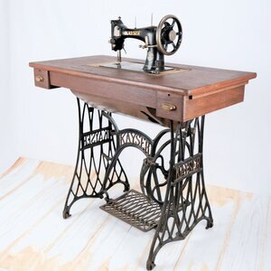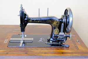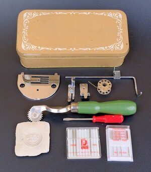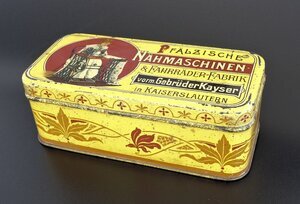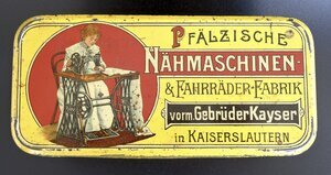 Die gut erhaltene Box ist bedruckt mit dem Bild einer jungen Frau, die an einer Kayser Nähmaschine arbeitet. Daneben in großen Buchstaben der Hersteller die "Pfälzische Nähmaschinen- & Fahrradfabrik vorm. Gebr. Kayser, Kaiserslautern" Die Blechschachtel ist in hellgelb lackiert & rot lackiert. Die Seiten sind umlaufend mit Verzierungen versehen. Der Inhalt besteht aus einem Langschiffchen mit Spule, verschiedene Zubehörteile einschließlich einer Packung Singer Ersatznadeln. Interessant ist ein Zubehörteil (in der 2. Reihe links). Hergestellt aus Messing und, aus welchen Gründen auch immer, mit Blei gefüllt. Daneben das gleiche Teil, wohl später nachgekauft, ist aus verchromten Blech. Der Gewichtsunterschied, 27gr. zu 9 gr. ist beachtlich.