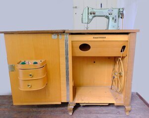Unsere Phönix Haushaltsnähmaschine mit der Fabriknummer B 527657 stammt aus den 1950er Jahren. Um diese Zeit ging die Farbgestaltung der Maschinen weg von dem Schwarz, hin zu freundlicheren Farben. Die Phönix 283 gilt als qualitativ hochwertig, sie ist solide gebaut und hat, bei guter Pflege, ein nahezu unbegrenztes Leben. Unser Modell ist versenkbar und in einen Schrank eingebaut. Die geöffnete Tür dient gleichzeitig als Stütze für den aufgeklappten Nähtisch. Die in der Türinnenseite angebrachten Schwenkfächer, bieten reichlich Platz für Nähutensilien. Die Phoenix 283 ist eine Flachbettmaschine mit Fußantrieb und Geradstich. Außer dem Geradstich beherrscht die Maschine einige Zierstiche, wozu allerdings entsprechende Schablonen (s. Abb) eingesetzt werden müssen. Der Antrieb erfolgt mittels Keilriemen und Fußpedal, zum Handrad. Innerhalb der Maschine übernimmt eine Schnurkette diesen Part. Die Schnurkette, mittlerweile Standard, unterstützt primär einen leisen und weichen Lauf. Auf dem Maschinenarm ist der Schriftzug "PHOENIX Automatic", die Klassenbezeichnung 283, auf der Innenseite des Ständers angebracht. Fest eingebaut ist die Nähleuchte. Ein elektrischer Antrieb kann nachgerüstet werden. Die Original Werkzeugbox mit Inhalt ist erhalten geblieben. (sieh Link)