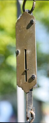 Federwaage die zum Gebrauch an einen Haken gehängt werden sollte. Die Frontplatte aus Messing zeigt in der oberen Hälfte den folgenden Text: No 2 SALTER IMPROVED SPRING BALANCE WARRANTED Die untere Hälfte besitzt einen Schlitz durch den ein Zeiger ragt. Dieser zeigt im unbelasteten Zustand auf 0 (bei dieser nicht mehr neuen Waage etwa auf 1). Hängt man unten an der Waage das Wiegegut an die Öse in dem etwas hervorstehenden Stift, so wird dieser gegen den Druck der eingebauten Feder heruntergezogen und auf der Skala wird das Gewicht des Wiegeguts angezeigt. Die (senkrechte) Skala reicht von 0 bis 24 und die geraden Werte sind mit Zahlen beschriftet. Ob es sich bei der Skala um metrische oder imperiale Maße handelt ist nicht erkennbar.