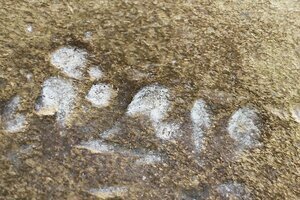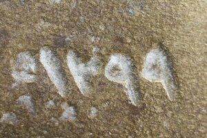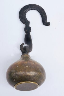 Kugelförmiges Gewichtsstück aus Messing mit einem oben angehängten künstlerisch gestaltetem Haken aus Eisen. Die zwei eingeschlagenen Punzen konnten leider nicht entziffert werden.