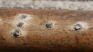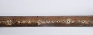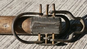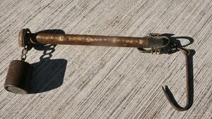 Es handelt sich um eine sehr einfache Laufgewichtswaage, Der Stab ist aus Holz und die Markierungen der beiden Skalen sind mit Eisenstiften eingeschlagen. Meist ist es ein Stift, der eine Position markiert, manchmal (bei durch 6 teilbaren Einheiten) sind es 3 Stifte. Das Ausgleichsgewicht aus Eisen hängt an einer kreisförmigen Halterung am hölzernen Stab. Am Ende ist der Stab mit 3 eisernen Stiften durchbohrt. Diese dienen als Halterung für die beiden Bügel für die Halterungen an den Drehpunkten und als Halterung für den Haken für das Wägegut. Der Stift für das Wägegut ist genau durch die vertikale Mitte des Stabs gebohrt, die andern etwas nach oben in Richtung "ihrer" Skala. Bei dieser Waage hat ein wohlmeinender Restaurator den Haken für das Wägegut am falschen Haken befestigt. Dieser muss am letzten Bügel vor dem Ende des Stabs befestigt sein damit die Waage funktionsfähig ist. Die eisernen Bestandteile der Waage sind leicht von Flugrost befallen. Welches Gewichtsmaß den Skalen zugrunde liegt, ist unbekannt. Da immer 6 Untereinheiten eine Obereinheit bilden könnte es sich hierbei im imperiale Maße handeln. Bei der Vielzahl der im 18.Jh. im Gebrauch befindlichen Gewichtssysteme ist das jedoch nur eine Vermutung. Ebenso sind Herstellungsort und Hersteller unbekannt. Für den geschäftlichen Gebrauch dürfte sie spätestens seit der Einführung der Eichpflicht im Laufe des 19. Jahrhunderts nicht mehr zulässig gewesen sein, sodass eine Fertigung im 18.Jahrhundert oder im frühen 19.Jahrhundert angenommen werden kann. Das Prinzip einer Laufgewichtswaage: Eine Laufgewichtswaage ist eine asymmetrische Balkenwaage. In ihrer einfachsten Form besitzt sie (an Stelle des Waagebalkens) einen Stab, An diesem ist am Drehpunkt drehbar ein Haken oder ein Ring befestigt, an dem die Waage aufgehängt werden kann. Der Stab, der beim Wägevorgang in zwei ungleiche lange Hebelarme aufgeteilt. Am dem i.d.R. kürzeren Hebelarm hängt an einem Haken das Wägegut. An dem anderen, meist deutlich längeren Arm befindet sich das Ausgleichsgewicht das so lange verschoben werden kann bis in Abhängigkeit vom Gewicht des Wägeguts das Drehmoment auf beiden Seiten das Gleiche ist und somit Gleichgewicht eintritt. Je weiter das Ausgleichsgewicht nach aussen geschoben wird, desto größer wird das Drehmoment (umgangssprachlich die Hebelwirkung). Zugrunde liegt eine Sinusfunktion: ein doppelter Abstand verdoppelt das Drehmoment. Damit eröffnet sich die Möglichkeit mit einem einzigen und relativ leichtem Ausgleichgewicht auch größere Lasten zu wiegen. Festzuhalten ist, dass das Ausgleichsgewicht vom Drehpunkt aus gesehen sich immer auf der gegenüberliegenden Seite befindet. Mit dem bekannten Gewicht (eigentlich der Masse) des Ausgleichsgewichts und dem Verhältnis der Abstände des Ausgleichsgewichts und des Wägeguts vom Drehpunkt kann man nun das Gewicht des Wägeguts errechnen. Damit man nun nicht bei jedem Wiegevorgang den Taschenrechner anwerfen muss, ist auf dem Teil des Stabs auf dem das Ausgleichsgewicht verschoben werden kann, eine Gewichtsskala angebracht. Um - wenn sie nicht im Gleichgewicht ist - ein sofortiges Durchschlagen der Waage zu vermeiden ist der Drehpunkt (vertikal) nicht in der Mitte des Stabs, sondern etwas höher. Laufgewichtswaagen mit zwei Skalen: Um eine einzige Laufgewichtswaage für kleine und große Gewichte einsatzfähig zu machen wurde die einfache Laufgewichtswaage wie folgt modifiziert: Es gibt zwei unterschiedliche Drehpunkte, von denen aber bei einem Wiegevorgang immer nur einer verwendet wird. Ein Drehpunkt ist relativ nahe am Haken für das Wägegut, der andere ist weiter davon entfernt. Der nähere ist für schwerere Lasten, da hier die relative Hebelwirkung des Ausgleichgewichts größer ist, der weiter entfernte Drehpunkt für kleinere Lasten und eine genauere Messung, da sich hier die größere Hebelwirkung nicht so stark auswirkt. Aufgrund der unterschiedlichen Hebelwirkung wird für jeden Drehpunkt nun eine eigene Skala benötigt. Dies wird gelöst, indem der Ring für den Drehpunkt eindeutig auf einer Seite angeschraubt (und dann auch oberhalb der Mitte des Stabs) befestigt wird. Die dazugehörige Skala ist dann oben auf der entgegengesetzten Seite des Stabs. Will man die andere Skala benutzen, so dreht man den Stab einfach um, benutzt den anderen Ring zur Befestigung des Wägeguts und klappt wenn nötig die Halterung des Wägeguts um, sodass dieses nun unter der anderen Seite des Stabs hängt. Damit kann man man das Gewicht des Wägeguts auf der anderen Skala ablesen.