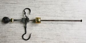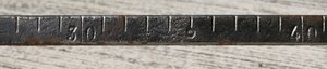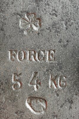 Es handelt sich um eine Laufgewichtswaage mit nur einer Skala. Die Waage hat als Besonderheit ein zweites Gewicht mit eigenem Stab (auf dem Foto) links von den Halterungen am Drehpunkt und dem Haken für das Wägegut zum (dauerhaften) Ausgleich des Taras. Wenn beispielsweise immer mit der gleichen Waagschale für das Wägegut gewogen wird, kann hiermit das Gewicht dieser ausgeglichen werden. Ist kein Gewicht auszugleichen, so befindet sich dieses Zweitgewicht ganz links, ist ein Gewicht auszugleichen wird es entsprechend nach rechts verschoben (weil dann schon das Tara des Wägeguts die Waage nach links unten zieht). Auf der Platte zwischen den beiden Stäben finden sich die folgenden Punzen; 1. Ein Kleeblatt, wohl das Logo des Herstellers, bei Schnieder so aber leider nicht abgebildet 2. FORGE - könnte auf einen französischen Hersteller oder einem aus einem englischsprachigen Land hinweisen 3. 54 KG - Höchstlast der Waage. Stimmt mit dem maximalen Wert auf dem Stab des Ausgleichsgewichts überein. Die Skala des Stabs mit dem Ausgleichgewicht hat Striche für Werte von 0 bis 54. Alle durch 10 teilbaren Werte zeigen die entsprechenden Zahlen, die durch 5 aber nicht durch 10 teilbaren Werte zeigen kleine Kreise. Die Skala für das Gewicht zum Ausgleich des Taras zeigt ein Skala mit Strichen und Zahlen von 0 bis 9 und rechts davon die Marke GL möglicherweise eine Abkürzung für "graphite lamellaire", auf Deutsch "Kugelgraphitguss". Dass die Waage aus Kugelgraphitguss hergestellt wurde ist jedoch zweifelhaft, da dieses Verfahren erst ab den 1940er Jahren zur Verfügung stand, Das Prinzip einer Laufgewichtswaage: Eine Laufgewichtswaage ist eine asymmetrische Balkenwaage. In ihrer einfachsten Form besitzt sie (an Stelle des Waagebalkens) einen Stab, An diesem ist am Drehpunkt drehbar ein Haken oder ein Ring befestigt, an dem die Waage aufgehängt werden kann. Der Stab, der beim Wägevorgang in zwei ungleiche lange Hebelarme aufgeteilt. Am dem i.d.R. kürzeren Hebelarm hängt an einem Haken das Wägegut. An dem anderen, meist deutlich längeren Arm befindet sich das Ausgleichsgewicht das so lange verschoben werden kann bis in Abhängigkeit vom Gewicht des Wägeguts das Drehmoment auf beiden Seiten das Gleiche ist und somit Gleichgewicht eintritt. Je weiter das Ausgleichsgewicht nach aussen geschoben wird, desto größer wird das Drehmoment (umgangssprachlich die Hebelwirkung). Zugrunde liegt eine Sinusfunktion: ein doppelter Abstand verdoppelt das Drehmoment. Damit eröffnet sich die Möglichkeit mit einem einzigen und relativ leichtem Ausgleichgewicht auch größere Lasten zu wiegen. Festzuhalten ist, dass das Ausgleichsgewicht vom Drehpunkt aus gesehen sich immer auf der gegenüberliegenden Seite befindet. Mit dem bekannten Gewicht (eigentlich der Masse) des Ausgleichsgewichts und dem Verhältnis der Abstände des Ausgleichsgewichts und des Wägeguts vom Drehpunkt kann man nun das Gewicht des Wägeguts errechnen. Damit man nun nicht bei jedem Wiegevorgang den Taschenrechner anwerfen muss, ist auf dem Teil des Stabs auf dem das Ausgleichsgewicht verschoben werden kann, eine Gewichtsskala angebracht. Um - wenn sie nicht im Gleichgewicht ist - ein sofortiges Durchschlagen der Waage zu vermeiden ist der Drehpunkt (vertikal) nicht in der Mitte des Stabs, sondern etwas höher.