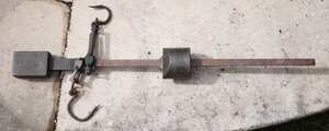 Große, schwere Laufgewichtswaage mit einer einzigen Skala, einem beweglich an der Waage angebrachten Haken zum Aufhängen der Waage und einem Haken zur Befestigung des Wägeguts. Die Waage besitzt ein bewegliches Laufgewicht und gegenüber zur Stabilisierung der Waage ein festes Gegengesicht. An der Spitze des Waagebalkens befindet sich eine Eichmarke mit der Zahl 34, d.h. die Waage wurde 1932 für 2 Jahre geeicht. Die 22 über dem geschwungenem Band bezeichnet den Eichaufsichtsbezirk Stuttgart, die untere Zahl 1B das Eichamt Esslingen. Die zusätzliche Kennzeichnung mit Buchstaben fand bei größeren Städten mit mehreren Eichämtern Anwendung. Da für gewerblich eingesetzte Waagen eine Eichpflicht bestand, wurde diese später nicht mehr gewerblich eingesetzt. Da derartige Eichmarken bei einer neuen Eichung ersetzt wurden, ist anzunehmen, dass diese Waage auch schon früher gewerblich genutzt wurde. Die Skala reicht von 0 kg bis 50 kg. Alle durch 5 teilbaren Werte sind mit einer Zahl versehen. Alle Kilowerte mit einem langen Strich und alle 200g Werte mit einem kurzen Strich. Das Prinzip einer Laufgewichtswaage: Eine Laufgewichtswaage ist eine asymmetrische Balkenwaage. In ihrer einfachsten Form besitzt sie (an Stelle des Waagebalkens) einen Stab, An diesem ist am Drehpunkt drehbar ein Haken oder ein Ring befestigt, an dem die Waage aufgehängt werden kann. Der Stab, der beim Wägevorgang in zwei ungleiche lange Hebelarme aufgeteilt. Am dem i.d.R. kürzeren Hebelarm hängt an einem Haken das Wägegut. An dem anderen, meist deutlich längeren Arm befindet sich das Ausgleichsgewicht das so lange verschoben werden kann bis in Abhängigkeit vom Gewicht des Wägeguts das Drehmoment auf beiden Seiten das Gleiche ist und somit Gleichgewicht eintritt. Je weiter das Ausgleichsgewicht nach außen geschoben wird, desto größer wird das Drehmoment (umgangssprachlich die Hebelwirkung). Zugrunde liegt eine Sinusfunktion: ein doppelter Abstand verdoppelt das Drehmoment. Damit eröffnet sich die Möglichkeit mit einem einzigen und relativ leichtem Ausgleichgewicht auch größere Lasten zu wiegen. Festzuhalten ist, dass das Ausgleichsgewicht vom Drehpunkt aus gesehen sich immer auf der gegenüberliegenden Seite befindet. Mit dem bekannten Gewicht (eigentlich der Masse) des Ausgleichsgewichts und dem Verhältnis der Abstände des Ausgleichsgewichts und des Wägeguts vom Drehpunkt kann man nun das Gewicht des Wägeguts errechnen. Damit man nun nicht bei jedem Wiegevorgang den Taschenrechner anwerfen muss, ist auf dem Teil des Stabs auf dem das Ausgleichsgewicht verschoben werden kann, eine Gewichtsskala angebracht. Um - wenn sie nicht im Gleichgewicht ist - ein sofortiges Durchschlagen der Waage zu vermeiden ist der Drehpunkt (vertikal) nicht in der Mitte des Stabs, sondern etwas höher.