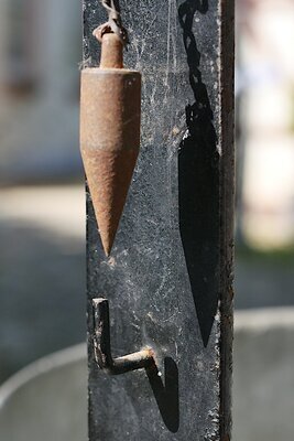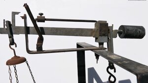 Es handelt sich um eine hydrostatische Waage zur Bestimmung der Dichte von Gegenständen. Funktionsweise der Waage: Der statische Auftrieb, den ein Körper erfährt, der in die Flüssigkeit eingetaucht wird, ist proportional zur Masse der verdrängten Flüssigkeitsmenge. Daraus kann bei bekanntem Volumen des Körpers auf die Dichte der Flüssigkeit geschlossen werden (Archimedisches Prinzip). Das Wägegut wird zweimal gewogen: Einmal normal in der Luft, und danach noch einmal in einem Wasserbad. Aus dem Gewichtsunterschied lässt sich die Dichte des Materials berechnen. Die Konstruktion der Waage: Die Waage besteht aus einem Blechkübel in den eine Korb mit dem Wägegut eingetaucht werden kann. Über diesem ist ein U-förmiges Gestänge montiert. Auf diesem sitzt eine Wägeeinrichtung in Form einer Dezimalwaage. Auf der rechten Seite des Waagbalkens ist ein festes Ausgleichsgewicht und die Halterung für das Wägegut. Der sehr deutlich längere linke Arm des Waagebalkens auf der linken Seite besitzt am Ende eine Halterung für die Gewichtsstücke mit denen das Gewicht des Wägeguts gemessen werden kann. Ein kleines Laufgewicht an einer eigenen Schiene über dem Waagebalken dient zum Ausgleich des Taras. Die Waage kann in die Waagrechte ausgerichtet werden, indem ein Senkgewicht, das neben dem U-förmigen Gestänge hängt, direkt über einen darunterliegenden Haken gebracht wird. Auf dem Waagbalken befinden sich mehrere Punzen: 20 kg : bezeichnet die Anwendungsgrenze der Waage (das maximale Gewicht für das sie zugelassen ist) Das Stempelzeichen dahinter ist das sogenannte Eichzeichen. Diese Stempelzeichen wurden bei der Erst-Eichung vom zuständigen Eichamt eingeprägt - also nicht von der Physikalisch Technischen Reichsanstalt (PTR). Dem Eichamt hat vorher die Bauartzulassung (Beglaubigung) der PTR für diesen Waagentyp des Herstellers vorgelegen, mit der die PTR dem Hersteller bescheinigt hat, dass seine Waage eichfähig ist. "DR" in der stilisierten Banderole steht für Deutschland - Das Kürzel DR für ursprünglich "Deutsches Reich" wurde bis 1975 verwendet. Zu dem Eichzeichen gehörten auch die Zahl "1" über und unter der Banderole. Die "1" über der Banderole stand als sogenannte Ordnungszahl für den Eichaufsichtsbezirk Berlin Die Ordnungszahl "1" unter der Banderole kennzeichnet das damalige die Eichung durchführende Eichamt in Berlin. Die "50" in der Schildumrandung ist die Angabe des Jahres, bis zu dem inclusive die Eichung gültig ist bzw. war. Die Waage wurde demnach höchstwahrscheinlich 1948 geeicht. Für diese Eichzeichen gab es in Abhängigkeit der zu eichenden Messgeräteart genaue Vorgaben für Stil und Größe der gestempelten (Schrift)-Zeichen. "Aptila": Ist das von der Firma eingeprägte Herstellerzeichen der Aptila GmBH, Berlin Z 410 steht entweder für "Zamak Zink-Druckguss-Legierung", dem Material des Waagbalkens oder es handelt sich um eine Herstellerkennung. ------ "PTR" steht für "Physikalisch-Technische Reichsanstalt" "1764 42 wb" ist das damals so genannte "Zulassungszeichen" oder "Beglaubigungszeichen" für die Waage. "1764" ist eine vom Waagenlabor vergebene Nummer. Die Aufzeichnungen des Waagenlabors und erst recht die Zulassungen selbst sind uns nicht überliefert. Man kann davon ausgehen, dass sie entweder ab 1943 bei der Verlagerung von PTR-Laboratorien nach Thüringen oder später in den Kriegs- und Nachkriegswirren verloren gegangen sind oder vernichtet wurden. Ohnehin sind Zulassungsdokumente nicht langzeit-archivwürdig. "wb" steht als Abkürzung für das Labor, das die Bauartprüfung und Zulassung vorgenommen hat. "wb" bedeutet Labor b für Waagen (s.u.) "42" ist das Jahr der Beglaubigung/Zulassung. Laut dem Amtsblatt der Physikalisch-Technischen Reichsanstalt, 15. Reihe, Berlin 5. Juli 1939, Nr. 2, auf Seite 40 müssen "einfache Laufgewichtswaagen auf dem Balken neben der Kennzeichnung des Verfertigers der Waage eine Fabriknummer tragen." Die zeitliche Einordnung: Die Entstehung der Waage muss - falls sich die Punze Z 410 auf den Zinkdruckguss bezieht - nach der Entwicklung von Zink-Druckguss (1930er - Jahre) und vor dem Ende der Physikalisch- Technischen Reichsanstalt (1947) liegen. Leider lässt sich über die Marke / den Hersteller Aptila Berlin nichts herausfinden. Weiterhin war trotz ausführlicher Recherche kein Vergleichsobjekt zu finden. Da die Konstruktion der Waage als gesamtes ziemlich nach "do it yourself" aussieht, ist es durchaus möglich, dass sich der Firmenname nur auf die Mechanik der Waage, aber nicht auf die darunter liegenden Teile bezieht. Wir bedanken uns sehr herzlich bei Herrn Dr.-Ing. Joachim E. Meier, Referatsleiter und Bibliotheksdirektor der Physikalisch-Technische Bundesanstalt (PTB, Braunschweig) für die Unterstützung bei der Entschlüsselung der Punzen.