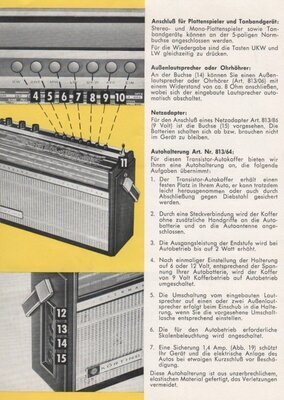 Die Anleitung für das Autoradio enthält 6 Seiten im DIN A5 Format. Beschrieben werden das Einsetzen der Batterien, die Bedienung der verschiedenen Tasten und Knöpfe, sowie eine Anschlussmöglichkeit für einen Plattenspieler. Optional kann zu diesem Kofferradio eine Autohalterung beschafft werden, mittels dieser der Betrieb im KFZ möglich wird. Der Anleitung ist die Kundendienstanweisung mit Schaltplan beigefügt.