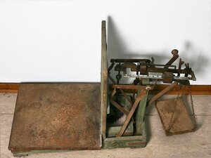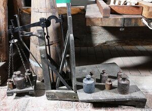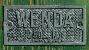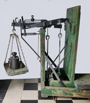 Dezimalwaage - umgangssprachlich auch Sackwaage genannt für Lasten bis 250 kg mit dem Markennamen Wenda. Waagen dieses Typs waren für verschiedene Maximalgewichte von 100 kg bis 500 kg erhältlich. Die Waage besitzt eine Brücke zum Ablegen der zu wiegenden Säcke oder anderem Wägegut, ein an Ketten aufgehängtes Brett zum Ablegen der Wägestücke. Die derzeit dort abgestellten Wägestücke sind nicht original von der Waage und dienen mehr der Deko. Die Waage besitzt ein Laufgewicht mit einer Skala bis zu 5 kg zum arbeitssparenden Einstellen des genauen Gewichts, sowie ein weiteres Laufgewichts zum genauen Austarieren der Waage und/oder zur Kompensation des Taras des Wägeguts. Mit Hilfe eines außen an der Waage angebrachten Senkgewichts kann die Waage genau in die Waagrechte austariert werden. Die Waage besitzt am Waagbalken mehrere z.T. nicht mehr lesbare in Blei eingedrückte Eichzeichen. Das neueste weist wahrscheinlich auf eine bis 1967 gültige Eichung hin. Zur Technik der Waage vergleiche für die prinzipielle Funktionsweise die beiden Weblinks und für diese Waage spezielle die Patentschrift bei den Abbildungen, wobei die hier beschriebene Waage sehr ähnlich aber nicht 100%ig identisch mit der Beschreibung in der damals schon ca 60 Jahre alten Patentschrift ist.