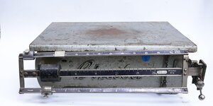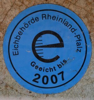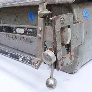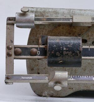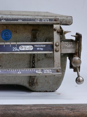 Bizerba Laufgewichtswaage, Sackwaage, Obstwaage, etc. mit der Produktionsnummer 30063. Auf den ersten Blick sieht sie ähnlich aus wie eine Haushalts- oder Babywaage ohne Schale. Sie war jedoch für den gewerblichen Einsatz bestimmt, da sie regelmäßig geeicht wurde, was auch durch die vielen Eichzeichen auf dieser Waage dokumentiert wird. Eichstempel befinden sich an allen 3 Skalen und am Gehäuse der Waage selber. Die Stempel an den beiden schmalen Skalen sind nicht mehr lesbar und in einem Fall auch ungültig gestempelt. Am der mittleren Skala befinden sich Stempel der Eichaufsichtsdirektion Stuttgart (Code 22, der Code des Eichamts darunter ist leider nicht mehr lesbar) mit Jahresstempeln von 56 bis 77 (d.h. Eichungen von 1954 bis 1975). Am Gehäuse der Waage befinden sich zwei Aufkleber der Aufsichtsdirektion von Rheinland-Pfalz von einer Eichung, die bis 2007 gültig war. Ältere Aufkleber wurden wohl bei einer neuen Eichung entfernt oder überklebt. Die Waage besitzt 4 Laufgewichte und 3 Skalen (auf den Waagbalken). Die unterste Skala läuft von 0 kg bis 5 kg und dient wie die Aufschrift "Tarastab" links an der Skala andeutet zum Ausgleich des Taras des Wiegeguts. Die mittleres Skala für das große Gewicht reicht von 0 kg bis 29 kg und bietet für jedes Kg für das Gewicht die Möglichkeit des Einrastens. An der oberen Skala befinden sich zwei Laufgewichte: Das linke dient zum Austarieren der Waage. Das rechte Laufgewicht läuft auf einer Skala von 0 kg bis 1 kg und dient zum Bestimmen des genauen Gewicht des Wägeguts (d.h. des Teil des Gewichts das über dem kilogenau in der mittleren Skala ermittelt wurde). Ein Senkgewicht an der Vorderseite der Waage hilft die Waage korrekt horizontal auszurichten. Die Waagbalken können rechts arretiert werden. Die Mechanik unterscheidet sich etwas von den Haushaltswaagen (s. die letzten Fotos). Die meisten Exemplare dieser Waage (die 2024 auf Plattformen wie ebay, kleinanzeigen, etsy, riccardo, etc. angeboten wurden) besitzen keinen Tarastab, der dadurch diese Waage zu etwas besonderem macht.