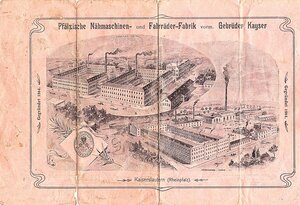 Original Garantieschein von dem Nähmaschinenhersteller Kayser für die von ihm hergestellt Nähmaschnine mit der Fabrik Nr. 646936 (siehe Link) Auf der Vorderseite findet sich die Maschinen Nummer und Umfang der Garantie. Der Schein, aus Papier ist aufwändig gestaltet und verziert. Auf der Rückseite sind die beiden Fabrikgebäude von der Fahrrad- und der Nähmaschinenproduktion abgebildet. Von dem Garantieschein wurden 5000 Stück gedruckt und lediglich die Fabriknummer im Nachhinein eingetragen.