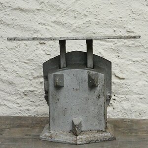 Oberschalige Haushalts Federwaage für eine Bereich von 0 kg bis 50 kg. Federwaagen bestimmen ein Gewicht aufgrund der Verformung einer im Inneren der Waage befindliche Feder. Die Waage besteht - von oben nach unten - aus einer mit dem Körper der Waage fest verbundenen Plattform und aus einer fünfeckigen Verblendung der Front im Stil der Art Deco. Hinter dieser befindet sich in der Mitte der mit zwei Schrauben befestigte Mechanismus der Waage, der auf einem Sockel steht. Das Ziffernblatt besitzt eine runde Skala - außen mit Gewichtsangaben von 1 bis 50 Kilo. Mit Zahlen in Kilogrammschritten, dazwischen ein mittellanger Strich mit der Beschriftung 500 und dazwischen kurze Striche. Zwischen diesen sind Striche in 50 g Abständen. Etwas weiter innen ist eine Skala von 0 bis 100 mit Angaben des Gewichts in Pfund und Strich und Zahl für jedes Pfund. Der blaue Zeiger ist aus Papier und gehört nicht zur originalen Ausstattung. Zwischen Anfang und Ende der Skala steht oben "KILO" und darunter das Symbol für Pfund. In der vertikalen Mitte steht neben der Befestigung des Zeigers links 50 und rechts Ko (für die Höchstlast der Waage).