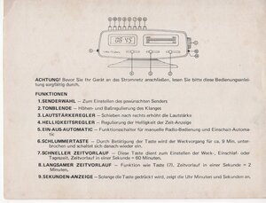 Die 6 seitige Bedienanleitung beschreibt zunächst die Funktionen des Radioweckers. Ausführlich werden die verschiedenen Einstellungen von Radio und Wecker beschrieben. Die in München ansässige Firma hat sich in den achtziger Jahren mit dem Vertrieb von Elektronischen Geräten beschäftigt.
