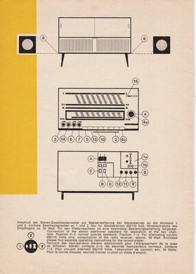 Mehrsprachige ( D; GB; F ), zweifarbige Anleitung im Format DIN A5. Bei dem vorgestellten Empfänger handelt es sich um einen modernen Empfänger ausgerüstet mit einem Stereo-Decoder und einem magischen Band zur genauen Sender-Abstimmung. Zur Schallplattenwiedergabe ist ein Plattenwechsler eingebaut.