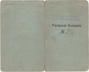 Auf graublauem Karton gedrucktes Formular, das von Hand mit schwarzer Tinte ausgefüllt wurde. Auf Vorderseite ist mit einem Stempel der Hinweis "Nur gültig für den Verkehr in dem besetzen Gebiete." und die Personalausweisnummer 54/6 geschrieben. Innen der Name und Beruf "Magnetograph & Quellensucher" sowie die Staatsangehörigkeit Preußen eingetragen. Darunter Geburts- und Wohnort, hier Bad Godesberg und die Personenbeschreibung. Auf der rechten Seite zeigt das Bild Matthis Leisen im Alter von 47 Jahren. Abgestempelt ist der Ausweis vom Bürgermeisteramt Bad Godesberg. In der Ausstellung ist eine Kopie des Ausweises ausgestellt.