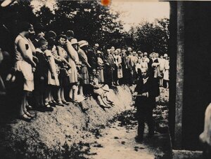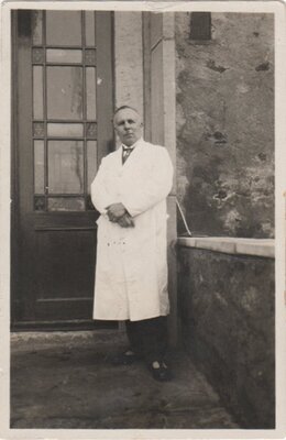 In einem ovalen geformten Holzrahmen eingepasstes Familienfoto der Familie von Matthias Leisen. In der Mitte Matthias Leisen, seine Frau Antoinette vor ihm auf der Sichtebene des Vaters die drei Jungen Nikolaus, Kaspar, Alex. Neben der Mutter stehen links Katharina und rechts Maria. Vermutlich wurde die Aufnahme an der 1. hl. Kommunion von Maria aufgenommen, denn sie trägt die seinerzeitige übliche Bekleidung für ein Kommunionkind mit weißem Blumenkranz und weißer Schleife auf dem Kopf. Das Foto ist für den Rahmen passend geschnitten und der obere Teil angefügt und zeichnerisch angepasst worden.