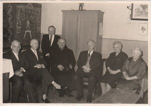 Drei schwarzweiß Fotografien sind von der Verabschiedung des Hauptlehrers Heinrich Kolbeck erhalten. Die Verabschiedung erfolgte in einem Klassenzimmer der alten, inzwischen abgerissenen, Volksschule. Auf der im Bild zu sehenden Schultafel sind Abschiedsworte der Schüler geschrieben und Bilder gemalt. Auf einem Foto überreicht ihm Bürgermeister Bauer das Abschiedsgeschenk, auf dem zweiten Foto wird ihm eine Ehrenrede gehalten und das dritte Foto zeigt die Abschiedsgesellschaft mit H. Kolbeck in der Mitte, Bürgermeister Bauer, Vorsitzender des Sportvereins, Mathias Kramprich, Pfarrer O. Czecholinski, und zwei namentlich nicht benannte Damen.