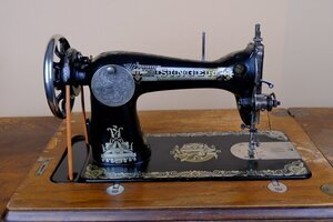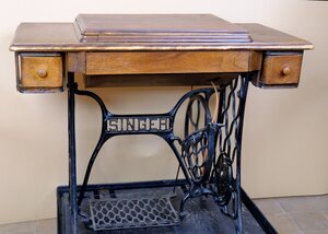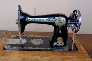 Diese Singer Nähmaschine gehört zur Modellreihe 15 (K). Hergestellt in New Jersey/USA unter der Fabriknummer Y 1.220.209 woraus sich das das Produktionsjahr 1923 ergibt. Technisch handelt es sich um eine Geradstich-Flachbett-Nähmaschine mit Eisengestell und Fußantrieb, Motoranbau möglich. Die ersten Maschinen des „Modells 15“ wurden ab 1895 ausgeliefert. Es war/ist eine hochwertige Nähmaschine, mit neuester Technik den diese Zeit damals zu bieten hatte Die Langlebigkeit der Maschine ist legendär ebenso ihr leichter und ruhiger Lauf. Die Maschine wurde -immer wieder mit Verbesserungen- über 100 Jahre lang gebaut, was auch auf ihre robuste Bauart zurück zu führen ist. Ein Merkmal für dieses Modell ist die Anordnung der Spannvorrichtung. Sie wurde -nicht wie üblich- an der Vorderseite eingebaut sondern an der Stirnplatte. Arm und Grundplatte der Nähmaschine haben eine schwarze Grundfarbe. Aufgelockert mit goldfarbenen Verzierungen. Auffallend dabei ist eine geflügelte Sphinx auf der Vorderseite des Ständers sowie auf der Grundplatte. Alle Verzierungen sind sehr gut erhalten. Das Untergestell ist aus Gusseisen mit dem Namenszug Singer in der Mitte und dem Singer Logo auf beiden Seitenteilen. Der Antrieb erfolgt über ein Fußpedal und Keilriemen. Die Maschine ist versenkbar und wird mit einem klappbaren Holzdeckel verschlossen. Unterhalb der Arbeitsplatte sind zwei Schubladen, zur Aufnahme von Zubehör und Nähutensilien, angebracht. Die Maschine selbst ist in einem sehr guten Zustand, das Furnier jedoch stark abgenutzt und beschädigt.