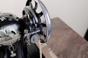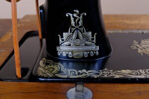 Diese Singer Nähmaschine gehört zur Modellreihe 15 (K). Hergestellt in New Jersey/USA unter der Fabriknummer Y 1.220.209 woraus sich das das Produktionsjahr 1923 ergibt. Technisch handelt es sich um eine Geradstich-Flachbett-Nähmaschine mit Eisengestell und Fußantrieb, Motoranbau möglich. Die ersten Maschinen des „Modells 15“ wurden ab 1895 ausgeliefert. Es war/ist eine hochwertige Nähmaschine, mit neuester Technik den diese Zeit damals zu bieten hatte Die Langlebigkeit der Maschine ist legendär ebenso ihr leichter und ruhiger Lauf. Die Maschine wurde -immer wieder mit Verbesserungen- über 100 Jahre lang gebaut, was auch auf ihre robuste Bauart zurück zu führen ist. Ein Merkmal für dieses Modell ist die Anordnung der Spannvorrichtung. Sie wurde -nicht wie üblich- an der Vorderseite eingebaut sondern an der Stirnplatte. Arm und Grundplatte der Nähmaschine haben eine schwarze Grundfarbe. Aufgelockert mit goldfarbenen Verzierungen. Auffallend dabei ist eine geflügelte Sphinx auf der Vorderseite des Ständers sowie auf der Grundplatte. Alle Verzierungen sind sehr gut erhalten. Das Untergestell ist aus Gusseisen mit dem Namenszug Singer in der Mitte und dem Singer Logo auf beiden Seitenteilen. Der Antrieb erfolgt über ein Fußpedal und Keilriemen. Die Maschine ist versenkbar und wird mit einem klappbaren Holzdeckel verschlossen. Unterhalb der Arbeitsplatte sind zwei Schubladen, zur Aufnahme von Zubehör und Nähutensilien, angebracht. Die Maschine selbst ist in einem sehr guten Zustand, das Furnier jedoch stark abgenutzt und beschädigt.