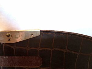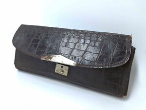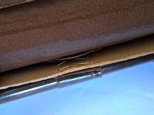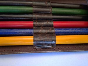 Das Mäppchen ist dunkelbraun und kann aufgeklappt werden. Es ist vermutlich aus einem Lederimitat gefertigt, dass außen die Struktur von Schlangen- oder Krokodilshaut aufweist und innen wie beschichtetes Leinen wirkt. Es gibt insgesamt elf Stiftschlaufen, von welchen noch acht mit Buntstiften, einem feinen braunen Pinsel und eine mit der Spitze eines Füllfederhalters bestückt sind. Die Ränder des Mäppchens sind mit braunem Garn vernäht, jedoch ist die Naht an vielen Stellen ausgerissen. Es gibt zwei Abschnitte mit Stiftschlaufen, welche mit Pappe unterlegt sind. Es ist zu erkennen, dass man das Leder(imitat) in Abschnitten zusammengerafft und dann an der Pappe festgetackert hat, so dass die Stiftschlaufen entstehen. Das Mäppchen besitzt einen metallenen Schließmechanismus, damit sich das Mäppchen nicht einfach im Schulranzen öffnen kann. Da das Mäppchen keinerlei Hinweise auf einen Hersteller besitzt, ist es schwer zu sagen, ob es gekauft wurde, oder mit seiner besonderen Herstellungsart eigenständig hergestellt wurde.