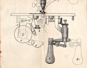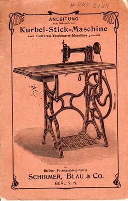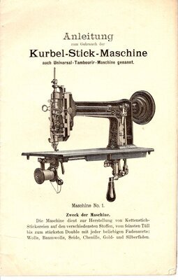 Die Gebrauchsanweisung für die Kurbel-Stick-Maschine oder auch Tambourier-Maschine genannt, beinhaltet die Bedienungsanleitung für die Modelle Nr 1, - Modell Nr 2A (hocharmiges Modell), - Modell 3 (hocharmiges Modell mit Schnur-Apparat), - Modell 4 (Konstruktion mit schwingender Rolle), - Modell Nr 5 (mit kombiniertem Soutachier- und Schnur-Apparat, und dem Modell Nr. 6 & 6K (mit den Apparaten für Soutachier-, Schnur-, Einlage- und Strahlenstich-Arbeiten). Auf 32 Seiten wird der Gebrauch, die Pflege der verschiedenen Modelle beschrieben. Für jedes Modell ist eine Zeichnung vorhanden. Die wichtigsten Stellen im Text, verweisen mittels Buchstaben auf den entsprechenden Bereich der Zeichnung. Am Schluss des Heftes ist noch eine ausklappbare Schnittzeichnung eingefügt. Die eingedruckten Buchstaben weisen ebenfalls auf entsprechende Textstellen hin. Auf der Rückseite des rot-braune Pappumschlags sind 20 Medallien in Gold und Silber abgebildet, die das Unternehmen gewonnen hat.
