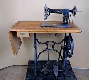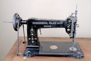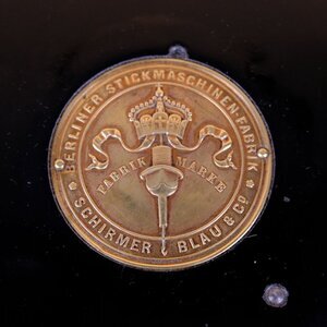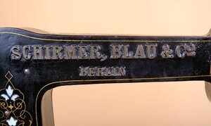 Ende des 19.Jhd. gab es bereits verschiedene Hersteller, die Stickmaschinen produzierten. Unser Objekt stammt von dem Berliner Unternehmen Schirmer, Blau & Co. Hergestellt unter der Seriennummer 7.201 schätzen wir die Herstellung auf ca. 1900. Um diese Zeit war die Entwicklung der Maschinen so weit fortgeschritten, dass Stickmaschinen auch in Privathaushalten Verwendung fanden. Mit ihnen konnte jedermann, feinste Stickereien in höchster Qualität herstellen. Ein wichtiges Teil dazu ist die Handkurbel, die sich unter dem hölzernen Sticktisch befindet. (Kurbelstickmaschine) Ihre geschickte Führung bestimmt die Qualität des Stickmusters. Der Nadelhaken folgt direkt der Kurbelbewegung, und kann dabei in jede beliebige Richtung bewegt werden. Mit etwas Geschick kann der Anwender (wurde meist von Männern bedient) leicht freihändig oder der Muster-Vorzeichnung folgen. Unsere Maschine ist schwarz lackiert mit Perlmutteinlagen auf dem Ständer und der Nähplatte. Mittig auf der Nähplatte ist sich eine Messing-Plakette eingelassen, mit dem Firmen Logo und Namen. Der Nähtisch kann bei Bedarf um ca. 30 cm verlängert werden. Unterhalb befindet sich eine Schublade zur Aufnahme von Werkzeugen, Ersatzteile und Nähutensilien (s. Bild). Abgedeckt ist die Maschine mit einer nachträglich angefertigten Haube . In den gusseisernen Unterbau ist eher schlicht gehalten. Es fällt aber auf, dass es kein übliches Tretpedal gibt, sondern zwei getrennte, in der Form eines Fußes. Das rechte Pedal dient dem Antrieb, mit dem Linken kann der Stickmechanismus schnell ein/ausgeschaltet werden. Wer an der Gebrauchsanleitung oder dem Heftchen zur Störungsbeseitigung interessiert ist, folge dem Link.