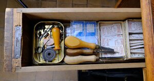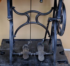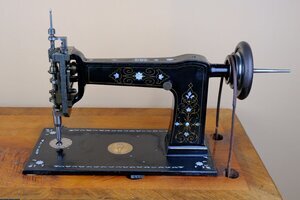 Ende des 19.Jhd. gab es bereits verschiedene Hersteller, die Stickmaschinen produzierten. Unser Objekt stammt von dem Berliner Unternehmen Schirmer, Blau & Co. Hergestellt unter der Seriennummer 7.201 schätzen wir die Herstellung auf ca. 1900. Um diese Zeit war die Entwicklung der Maschinen so weit fortgeschritten, dass Stickmaschinen auch in Privathaushalten Verwendung fanden. Mit ihnen konnte jedermann, feinste Stickereien in höchster Qualität herstellen. Ein wichtiges Teil dazu ist die Handkurbel, die sich unter dem hölzernen Sticktisch befindet. (Kurbelstickmaschine) Ihre geschickte Führung bestimmt die Qualität des Stickmusters. Der Nadelhaken folgt direkt der Kurbelbewegung, und kann dabei in jede beliebige Richtung bewegt werden. Mit etwas Geschick kann der Anwender (wurde meist von Männern bedient) leicht freihändig oder der Muster-Vorzeichnung folgen. Unsere Maschine ist schwarz lackiert mit Perlmutteinlagen auf dem Ständer und der Nähplatte. Mittig auf der Nähplatte ist sich eine Messing-Plakette eingelassen, mit dem Firmen Logo und Namen. Der Nähtisch kann bei Bedarf um ca. 30 cm verlängert werden. Unterhalb befindet sich eine Schublade zur Aufnahme von Werkzeugen, Ersatzteile und Nähutensilien (s. Bild). Abgedeckt ist die Maschine mit einer nachträglich angefertigten Haube . In den gusseisernen Unterbau ist eher schlicht gehalten. Es fällt aber auf, dass es kein übliches Tretpedal gibt, sondern zwei getrennte, in der Form eines Fußes. Das rechte Pedal dient dem Antrieb, mit dem Linken kann der Stickmechanismus schnell ein/ausgeschaltet werden. Wer an der Gebrauchsanleitung oder dem Heftchen zur Störungsbeseitigung interessiert ist, folge dem Link.