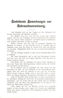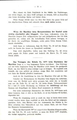 Bei der vorliegenden Anweisung handelt es sich um einen Nachdruck aus dem Jahr 2000. Außer der Einleitenden Bemerkung des Hersteller finden sich in dem 10 seitigen DIN A 5 Heftchen jede Menge nützlicher Winke zur Beseitigung eintretender Störungen. Die im Heftchen angegebenen Nummern beziehen sich auf die große Abb. in der Gebrauchs Anleitung zur Kurbel-Stickmaschine Scjirmer, Blau & Co, Berlin. (Link siehe unten)