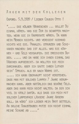 Postkarte vom 05.09.1909 aus Oxford, über den Ärger mit Kollegen