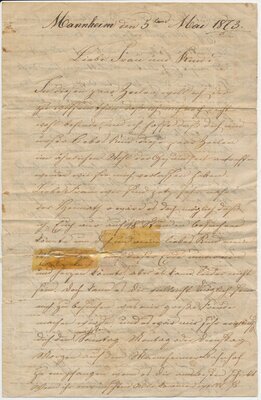 Brief des Jettenbacher Wandermusikanten Jakob Backes vom 05.05.1873 aus Mannheim an seine Frau und Kinder