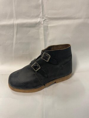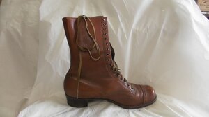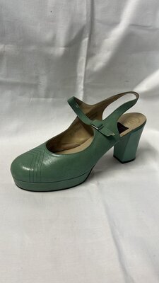 Ein Paar rötliche Damen-Sandaletten aus Leder. Runde Form, Schuhgröße 8. Die Schuhe haben einen Absatz aus Metall (10,5 cm), sowie einen Plateau von 2 cm. Sie verfügen über eine Fesselspange mit Schnallenverschluss um den Fuß, sowie zwei Riemen überkreuzt vorne am Schuh. Hergestellt für die Marke "Odys&Feibo". Datiert auf die 1970er.