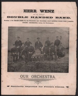 Auch die Zirkusunternehmen in den USA engagierten in der Zeit um 1900 mit Vorliebe Pfälzer Musikanten. Hier: Die Kapelle Wenz aus Bosenbach, die in der Reklameschrift des Circus Fillis als kombinierte Blas- und Streichmusik vorgestellt wird.