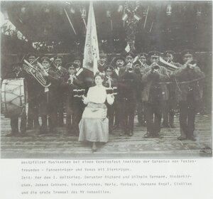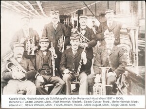 Kapelle Walk, Niederkirchen, als Schiffskapelle auf der Reise nach Australien (1897-1900); stehend v.l.: Gödtel Johann, Morbach, Walk Heinrich, Niederkirchen, Strack Gustav, Morbach, Merle Heinrich, Morbach; sitzend v.l.: Strack Wilhelm, Morbach, Forsch Johann, Heimkirchen, Merle August, Morbach, Sorger Jakob, Morbach (PE)