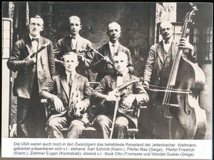 Die USA waren auch noch in den Zwanzigern das beliebteste Reiseland der Jettenbacher. Weltmännisch gekleidet präsentieren sich v.l.: stehend: Karl Schmitt (Klarinette), Pfeifer Max (Geige), Pfeifer Friedrich (Klarinette), Ziehmer Eugen (Kontrabass); sitzend v.l.: Bock Otto (Trompete) und Wendel Gustav (Geige) (PE)