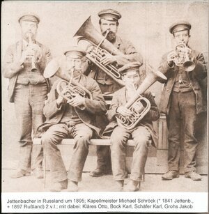 Jettenbacher in Russland um 1895; Kapellmeister Michael Schröck (* 1841 Jettenbach, + 1897 Russland) 2.v.l.; mit dabei: Kläres Otto, Bock Karl, Schäfer Karl, Groß Jakob (PE)