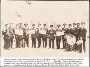 Scheweninger Kurkapelle (Holland) i.d.J. 1927/28/29, in der Nachfolge der Kaulbacher Ullrichs-Kapelle; Stehend v.l.: Bier Heinrich., Kaulbach, Hamm Eugen, Wendel Luitpold, Kläres August, Schinkel Ludwig (alle Jettenbach), Christmann Karl, Aschbach; sitzend v.l.: Wendel Ludwig, Leonhard Edmund (Informant für „Auf den Straßen der Welt“), Schäfer Otto, Rheinheimer Julius (alle Jettenbach), Martin Ludwig, Kreimbach, Jung Heinrich, Kaulbach, Schwarz Gustav, Hinzweiler (PE)