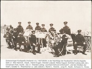 Scheweninger Kurkapelle (Holland) i.d.J. 1927/28/29, in der Nachfolge der Kaulbacher Ullrichs-Kapelle; Stehend v.l.: Bier Heinrich., Kaulbach, Hamm Eugen, Wendel Luitpold, Kläres August, Schinkel Ludwig (alle Jettenbach), Christmann Karl, Aschbach; sitzend v.l.: Wendel Ludwig, Leonhard Edmund (Informant für „Auf den Straßen der Welt“), Schäfer Otto, Rheinheimer Julius (alle Jettenbach), Martin Ludwig, Kreimbach, Jung Heinrich, Kaulbach, Schwarz Gustav, Hinzweiler (PE)