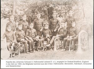 Kapelle des Johannes Schwarz II, Hefersweiler (sitzend 5. v.l.), engagiert im Seebad Bradford, England in der Zeit vor 1900; die Mitglieder kommen aus den Orten: Hefersweiler, Berzweiler, Adenbach, Ginsweiler und Niederkirchen (PE)
