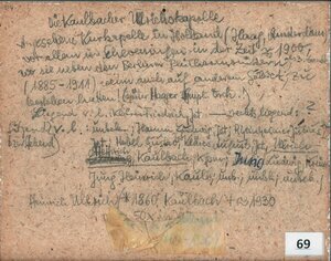 Die Kaulbacher Ullrichskapelle / Angesehene Kurkapelle in Holland (Haag, Amsterdam), vor allem im Seebad Scheweningen in der Zeit vor und nach 1900 geschätzt, wo sie neben bedeutenden Symphonieorchestern (Berliner Philharmoniker, später Haager Symphoniker) musikalisch zu bestehen hatte. V.l.: 2. Hamm Ludwig, Rheinheimer Julius, Hebel Gustav, Kläres August (alle Jettenbach), Ullrich Heinrich (1860-1930), Kaulbach, Martin Ludwig, Kreimbach, Jung Heinrich, Kaulbach,; 1. liegend: Kläres Friedrich, Jettenbach (PE)