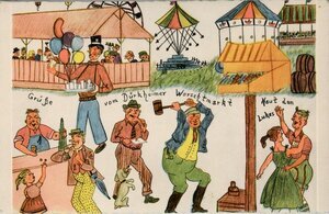 Die querformatige Postkarte zeigt eine farbenfrohe Zeichnung im Comic-Stil, die die lebhafte Atmosphäre des Dürkheimer Wurstmarkts in verschiedenen Szenen einfängt. Auf der linken Seite der Postkarte sind im Vordergrund zwei Personen zu sehen, die vor einer Theke stehen und Wein trinken, währen ein Mädchen versucht, etwas aus der Theke zu greifen. In der Mitte der Postkarte verläuft der Schriftzug „Grüße vom Dürkheimer Worschtmarkt“. Auf der rechten Seite weist der Text „Haut den Lukas“ auf ein traditionelles Jahrmarktspiel hin, bei dem eine Figur mit einem Hammer auf ein Ziel schlägt. Dahinter steht ein Verkäufer, der mehrere bunte Luftballons in der Hand hält. Im Hintergrund ist ein gut besuchtes Weinzelt zu sehen, wie es auf deutschen Weinfesten üblich ist. Dahinter erhebt sich ein Riesenrad, umgeben von weiteren Jahrmarktsattraktionen. Der Rand der Postkarte ist gezackt. Der Dürkheimer Wurstmarkt, bekannt als das größte Weinfest der Welt, hat seine Ursprünge im Jahr 1417. Damals als Michaelismarkt auf dem Michelsberg gefeiert, war das Fest ursprünglich ein religiöses Ereignis zu Ehren des Erzengels Michael. Die ansässigen Bauern und Winzer boten den Besuchern ihre Produkte wie Wein, Wurst und Brot an. Aus dem einstigen Pilgermarkt wuchs mit der Zeit ein lebendiger Marktplatz heran, der immer mehr Händler und Besucher aus der Region anzog. Wegen Platzmangels wurde der Markt im 15. Jahrhundert auf die Brühlwiesen verlegt, wo er bis heute stattfindet. Der Name „Wurstmarkt“ etablierte sich im 19. Jahrhundert aufgrund des enormen Wurstkonsums während des Festes. Heutzutage lockt das neuntägige Spektakel jedes Jahr im September über 600.000 Besucher an, die sich an den regionalen Weinen und der festlichen Stimmung erfreuen. Auf der Rückseite der Postkarte weist den Text „Verlag Peukert, Bad Kreuznach Nr. 7“ auf den Postkartenverlag hin. Ein Rundstempel trägt die Aufschrift „Gruß vom Dürkheimer Wurstmarkt“. Die Postkarte ist unbeschriftet und postalisch ungelaufen.