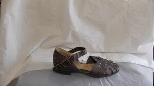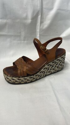 Eine Einzelne Braune Damen-Sandalette aus Leder. Der Schuh hat eine Runde Form, einen geflochtenen Keilabsatz (8 cm) und einen geflochtenen Plateau von 3,5 cm. Er verfügt über einen Riemen um den Knöchel mit Schnallenverschluss und der Riemen vorne über dem Fuß ist geflochten . Datiert auf die 1970er Jahre.