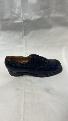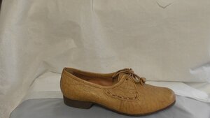 Ein Paar Rotbraune Damen-Sportschuhe aus Leder. Die Schuhe haben eine Runde Form und einen metallgenagelten Blockabsatz (2,5 cm). Sie verfügen zudem über eine Schnürung mit Ösen auf der Innenseite. Die Schuhgröße der Schuh ist 3,5. Hergestellt für die Marke "Steitz". Datiert auf 1949.