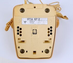 Der FTA 67.2 wurde von der Firma Krone 1967 auf den Markt gebracht. (Es war eine leicht veränderte Version des T 65 der für den Niederländischen Markt gebaut wurde) Der FTA 67.1 und 67.2 wurde von keiner Telefongesellschaft als Standardgerät eingesetzt. Verwendung fand er ausschließlich in Firmennetzwerken. Obwohl der Apparat weltweit vertrieben wurde, blieb die gesamt Produktion überschaubar. In Deutschland ist das Gerät sehr selten anzutreffen. Mehr Glück kann der Suchende in Finnland haben. Das Telefon wurde in mehreren Farben hergestellt. In unserem Bestand haben wir diesem okergelbenen Apparat, auch noch ein rotes Modell. Die Zahlenscheibe bildet, in hellbeigen, einen gelungenen Kontrast. Auf der Unterseite befindet sich der Drehschalter für die Lautstärkeneinstellung.