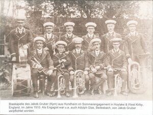 Blaskapelle des Jakob Gruber (Kapellmeister) aus Hundheim im Sommerengagement in Hoylake & West Kirby, England, im Jahre 1910. Als Engagist war u.a. auch Adolph Glas, Bedesbach, von Jakob Gruber verpflichtet worden. (PE)