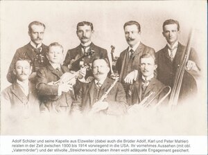 Adolf Schüler und seine Kapelle aus Elzweiler (dabei auch die Brüder Adolf, Karl und Peter Mahler) reisten in der Zeit zwischen 1900 bis 1914 vorwiegend in die USA. Ihr vornehmes Aussehen (mit obl. „Vatermörder“) und der stilvolle „Streichersound” haben ihnen wohl adäquate Engagements gesichert. (PE)