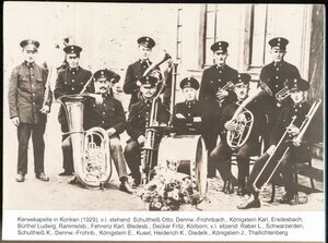 Kerwekapelle in Konken (1929); v.l. stehend: Schultheiß Otto, Dennweiler-Frohnbach, Königstein Karl, Erdesbach, Bürthel Ludwig, Rammelsbach, Fehrenz Karl, Bledesbach, Decker Fritz, Körborn; v.l. sitzend: Raber Ludwig, Schwarzerden, Schultheiß Karl, Dennweiler-Frohnb., Königstein Emil, Kusel, Heiderich Karl, Diedelkopf, Königstein Jakob, Thallichtenberg (PE)
