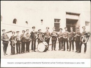 Vierzehn, vorwiegend jugendliche Jettenbacher Musikanten auf der Frankfurter Herbstmesse im Jahre 1885. (PE)